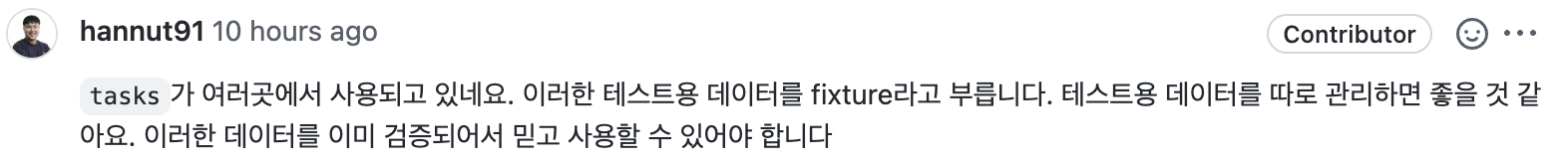 // describe - it => describe('List') => it('render tasks'); // with tasks // - List renders tasks // - List renders 'delete' button to delete a task // without tasks // - List renders no tasks message describe('List', () => { const handleClickDelete = jest.fn(); function renderList(propsTask) { return render(<List tasks={propsTask} onClickDelete={handleClickDelete} />); } context('with tasks', () => { it('renders tasks', () => { const { getByText } = renderList(tasks); expect(getByText(/뭐라도 하기/)).not.toBeNull(); expect(getByText(/코드숨 과제/)).not.toBeNull(); }); it('render "완료" button to delete a task', () => { const { getAllByText } = renderList(tasks); const buttons = getAllByText('완료'); fireEvent.click(buttons[0]); expect(handleClickDelete).toBeCalledWith(1); }); }); context('without tasks', () => { const emptyTasks = []; it('renders no task message', () => { const { getByText } = renderList(emptyTasks); expect(getByText(/할 일이 없어요!/)).not.toBeNull(); }); }); });3. Fixture에 대해 알게 되었다.