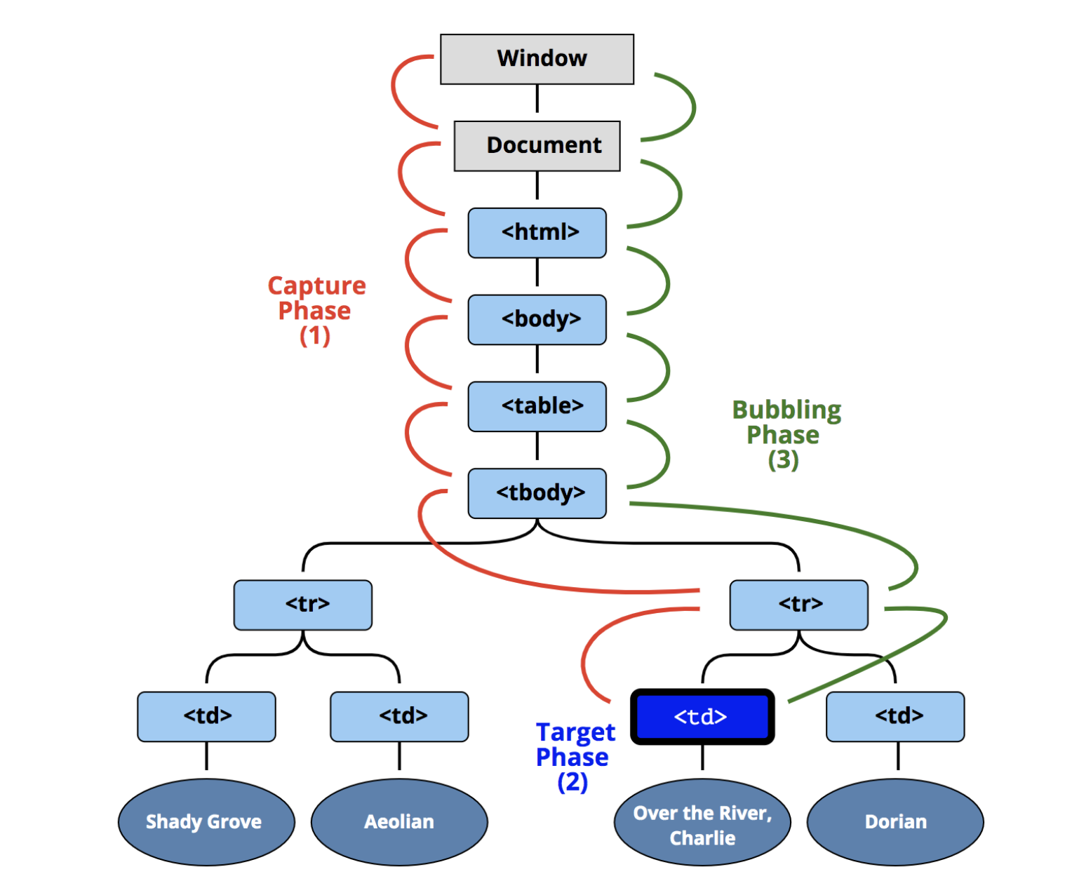 1단계 - 캡쳐링 단계: window로 부터 타켓 엘리먼트까지 이벤트가 아래로 전달