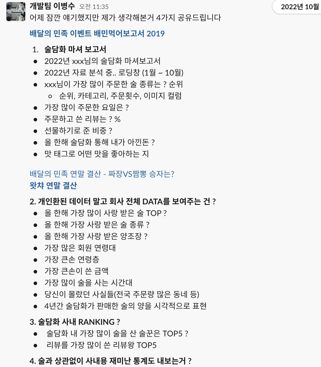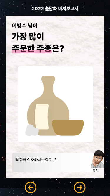 아싸 내가 제안한 1번이 채택됨! 물론 혜택은 없다 우리가 과반수로 우선 선택한 아이디어는 내가 제안한 연말결산 이 되었다. 즉 1년 간의 데이터를 가지고 개인별 연말 결산 데이터를 시각적으로 보여주는 것이다. 이름도 멋드러지게 술담화 마셔보고서 로 지었다.