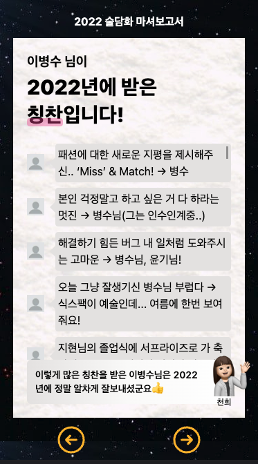 각자가 22년에 받은 모든 칭찬을 긁어 모아 보여주는 페이지를 만들기로 했다.