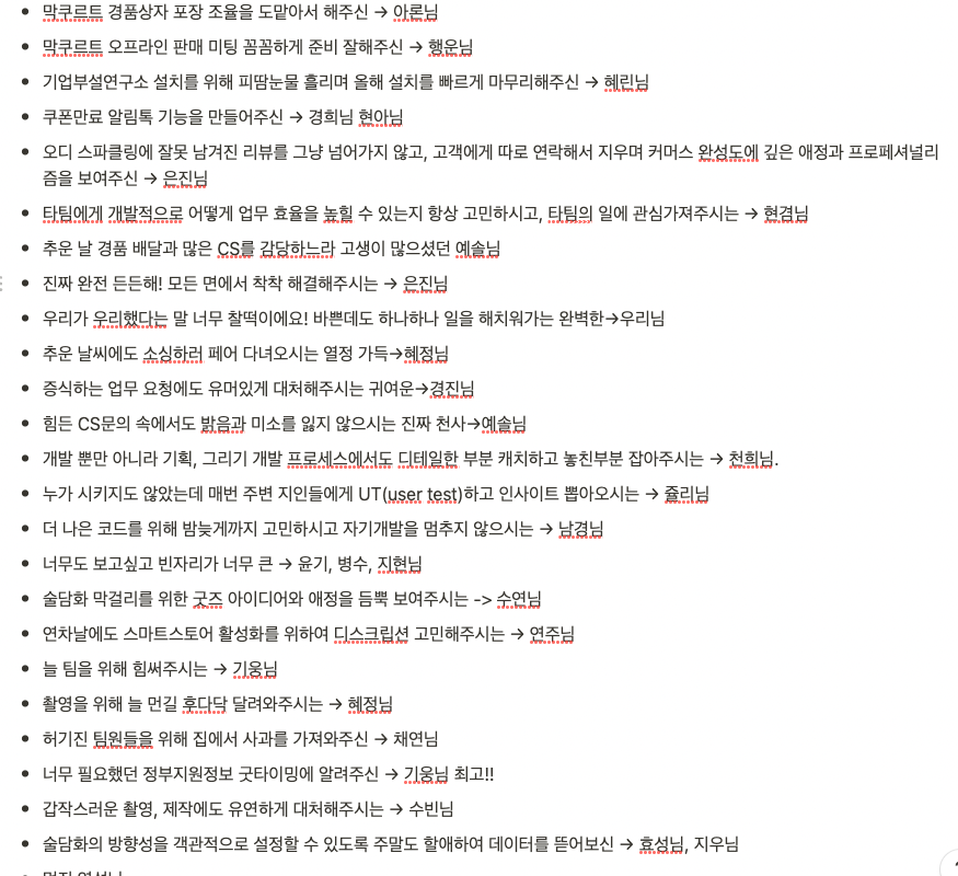 술담화에는 매 주 서로에게 칭찬하는 문화가 있다. 1월부터 ~ 12월까지 각자가 받은 칭찬을 통해 한 해를 돌아보며 스스로 "잘달려 왔구나, 수고 많았다." 라는