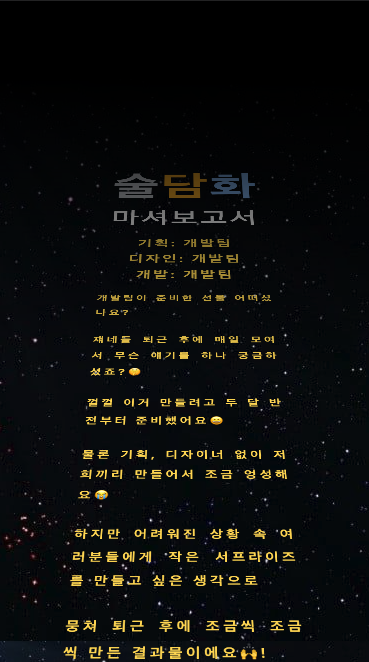 이 사이드프로젝트는 처음부터 명확한 타겟과 릴리즈 일정이 정해져 있던 프로젝트였다. 타겟은 술담화 구성원이고 릴리즈 일정은 종무식때 서프라이즈로 공개하는 것을 목표로 했다. 하지만 종무식 중간에 우리 마음대로 오픈 할 수는 없기 때문에 종무식을 준비 해주시는 동료분과 미리 협의하는 과정이 필요했다.