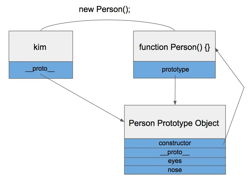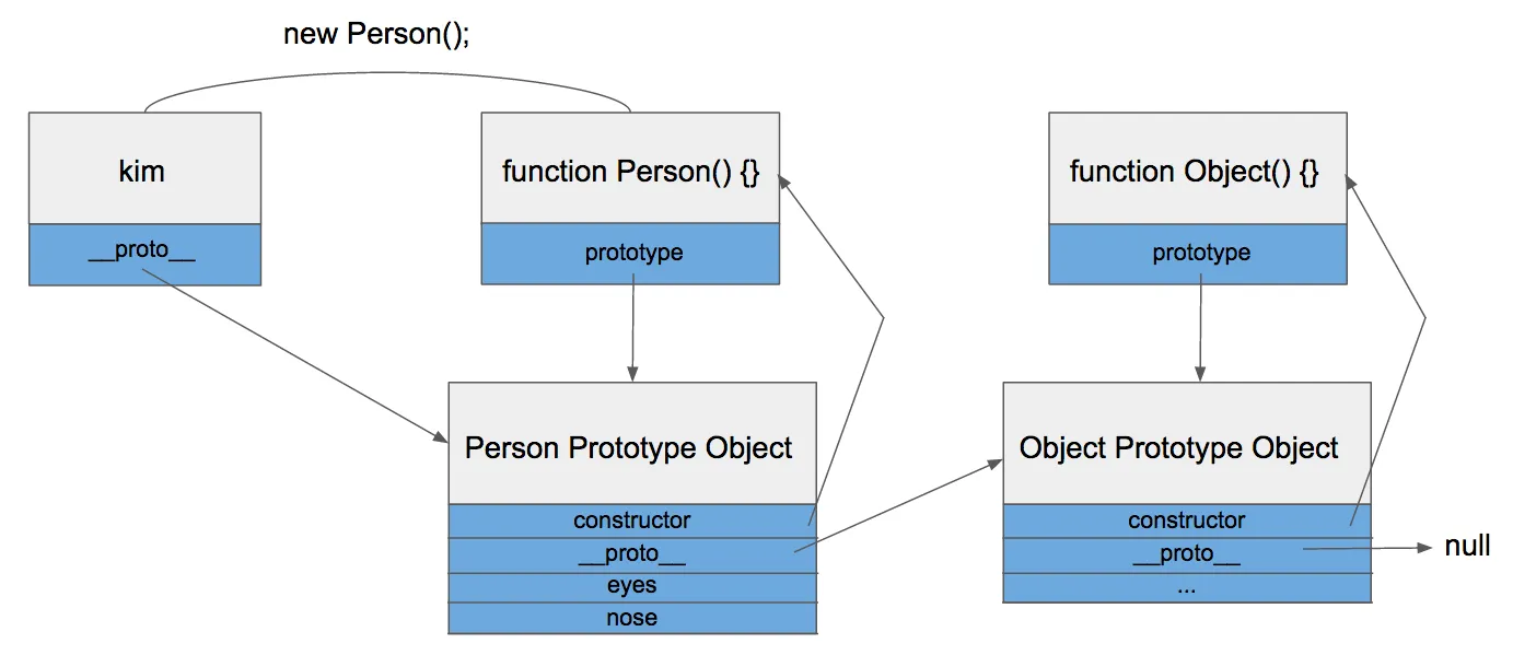 - __proto__ 는 객체가 생성될 때 조상이었던 함수의 Prototype Object 를 가리킴 (kim 객체는 Person 함수로 부터 생성
